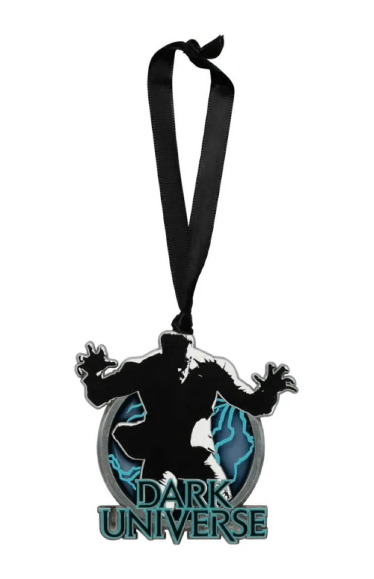 Dark Universe metal ornament featuring a menacing Frankenstein lurching forward from the shadows surrounded by lightning strikes with "Dark Universe" across the bottom.