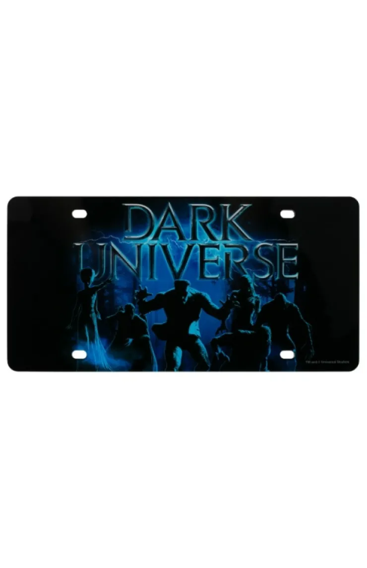 Dark Universe license plate featuring a group of menacing monsters creeping forward out of the shadows with "Dark Universe" across the top surrounded by lightning.