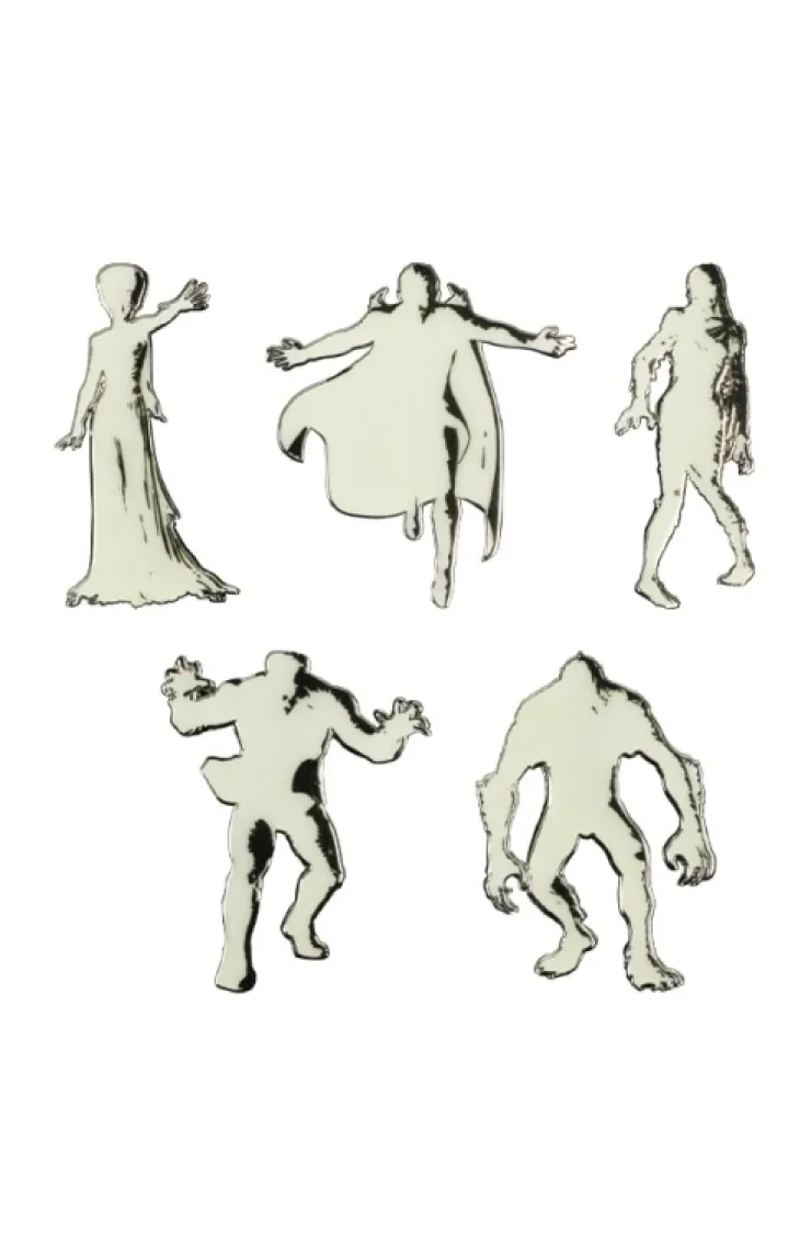 Dark Universe monsters five pin set featuring Glow-In-The-Dark silhouettes of The Bride, Frankenstein, Dracula, The Creature and The Mummy.