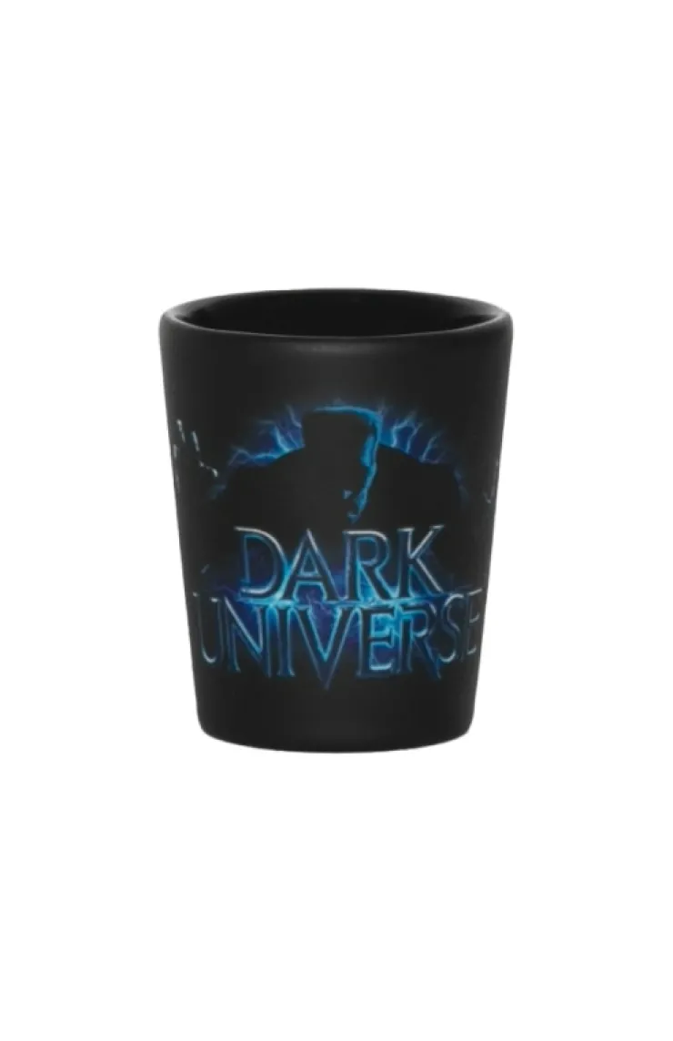 Dark Universe matte black shot glass featuring a menacing Frankenstein lurching forward from the shadows surrounded by lightning with "Dark Universe" across the front.