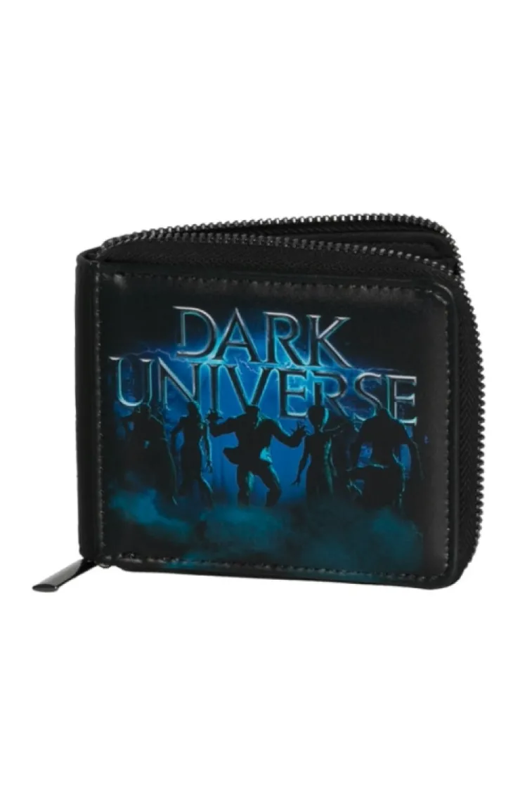 Dark Universe zippered wallet featuring a group of menacing monsters creeping forward out of the shadows with "Dark Universe" across the top surrounded by lightning.