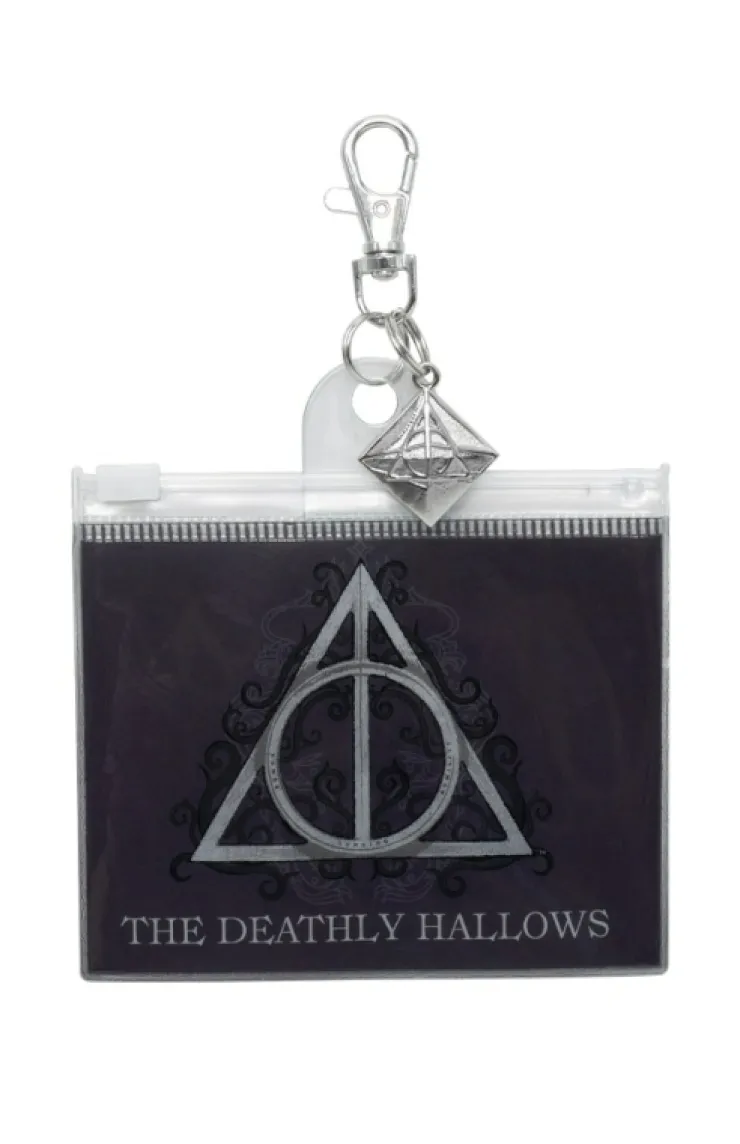 Deathly Hallows re-sealable lanyard pouch from The Wizarding World of Harry Potter™ featuring a dark purple background, filigree details, and dangling Deathly Hallows charm.