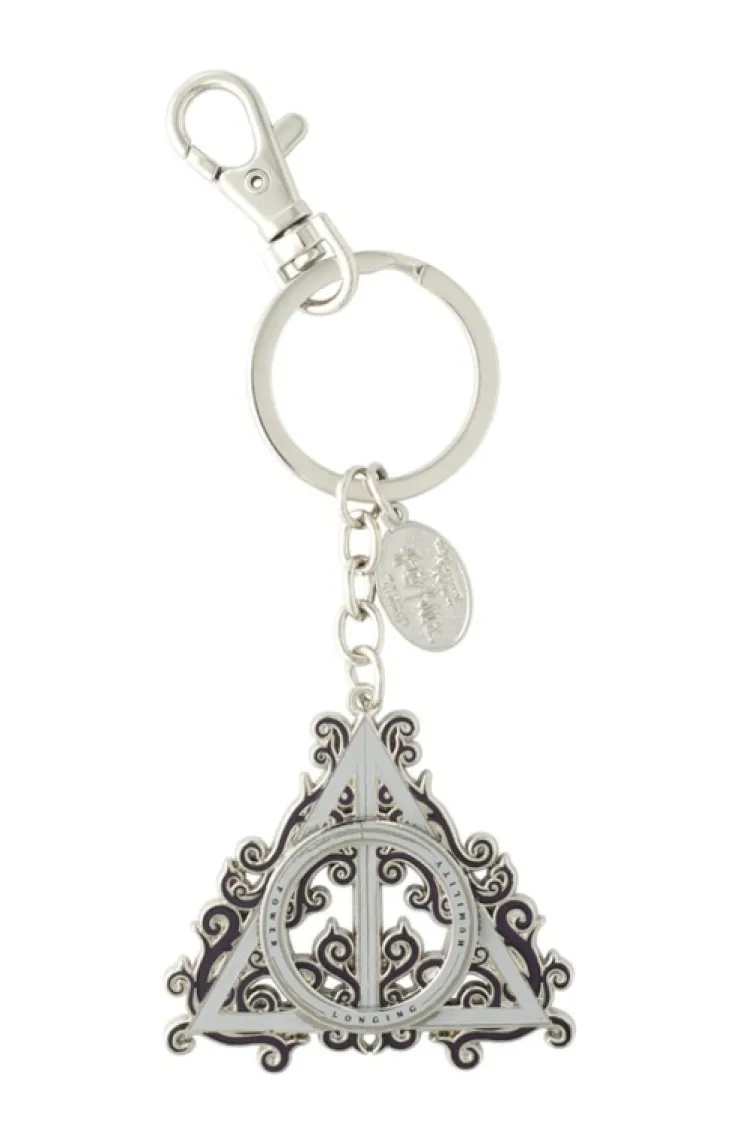 Deathly Hallows keychain from The Wizarding World of Harry Potter™ with filigree design and word details "Power", "Longing" and "Humility" on the front to represent the three hallows traits.