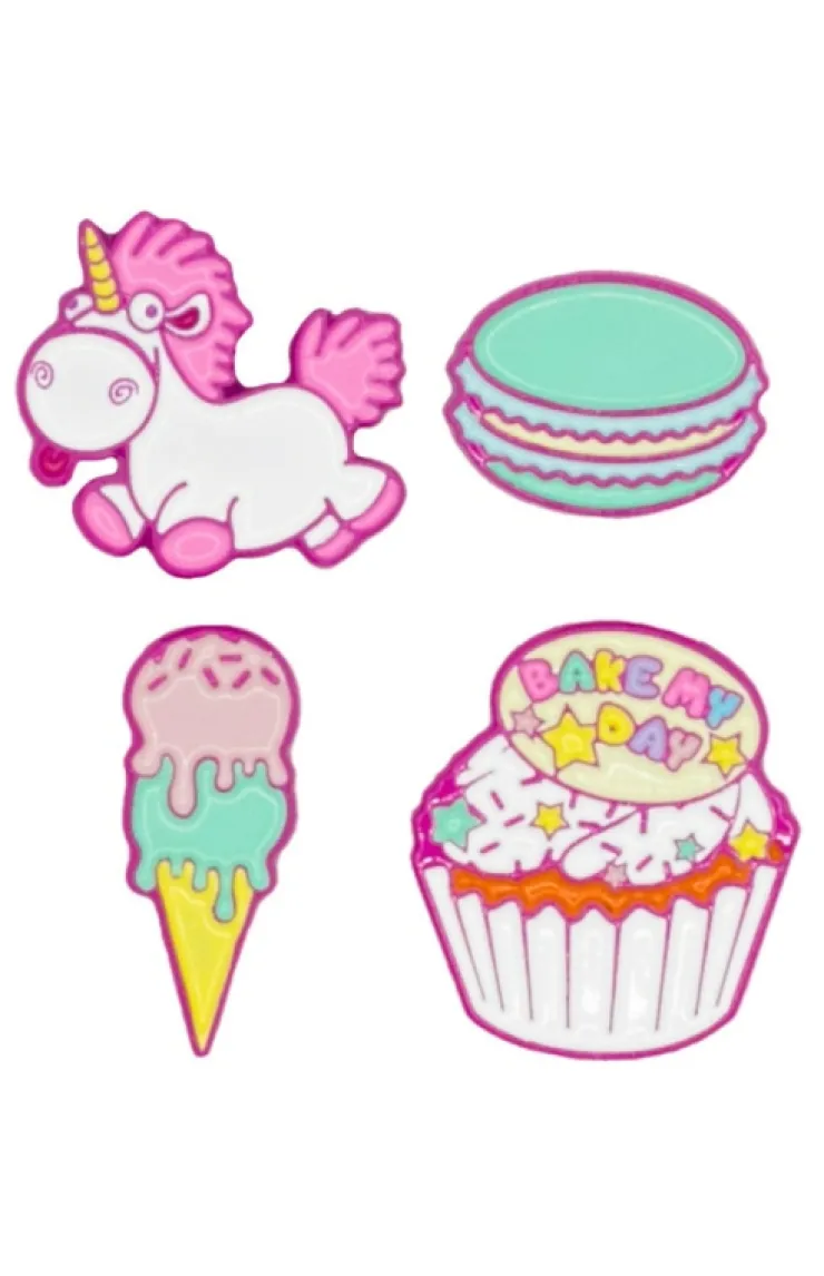 Adorable set of 4 miniature pins featuring Fluffy and favorite "Bake My Day" treats. Design is a hard enamel fill with pink toned metal.
