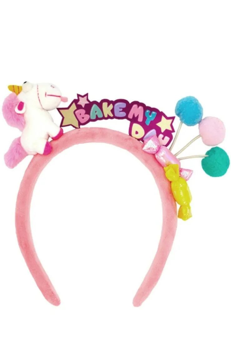 Show your love for Despicable Me's iconic bakery "Bake My Day" by wearing this adorable headband. Design features Fluffy Unicorn, "Bake My Day" sign, and various sweet treats.