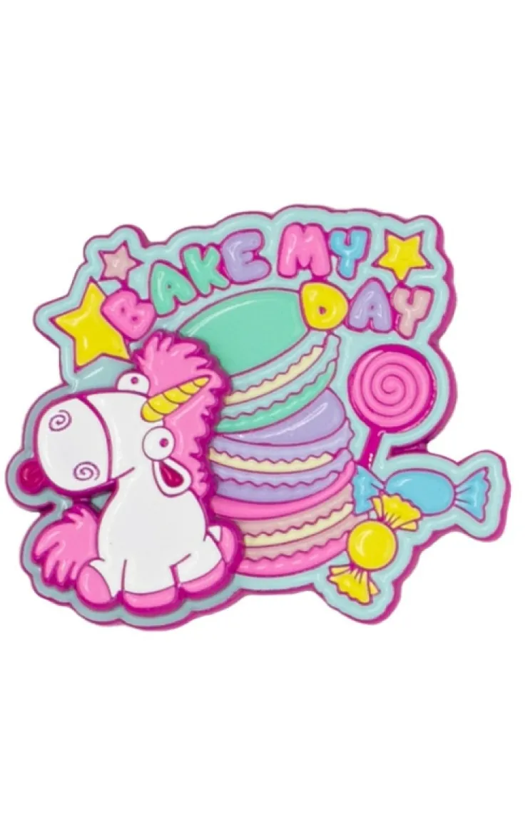 "Bake My Day" pin features Fluffy Unicorn with some delicious sweets. Pin on pin design features include a pink toned metal with hard enamel fill and tack pin back.