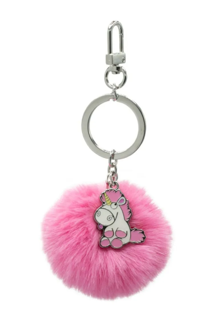 Super Soft pink Pom Pom featuring an adorable Fluffy charm. Keychain design is enamel filled on pink-toned metal and a lobster clasp for on-the-go accessorizing.