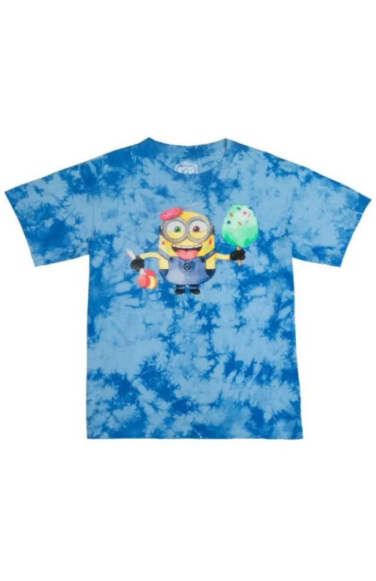 Show your love for Minions with this youth t-shirt featuring Bob with various sweet treats. Screen printed Minion design on a blue tie dye garment.