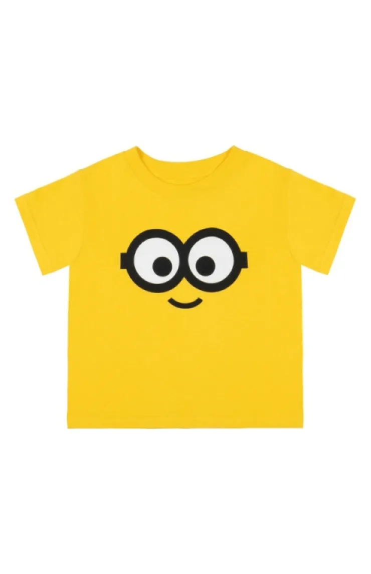 Despicable Me toddler t-shirt in the color yellow featuring a two-eyed Minion on the front with "Le Buddies" across the back.