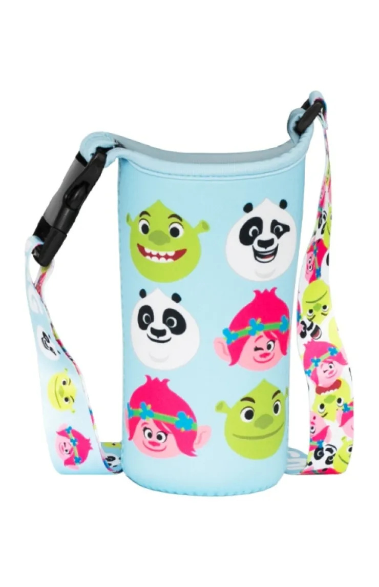 DreamWorks Land beverage holder in the color blue featuring Shrek, Po and Poppy in a cute cartoon design with "Just Chilling" on the strap.