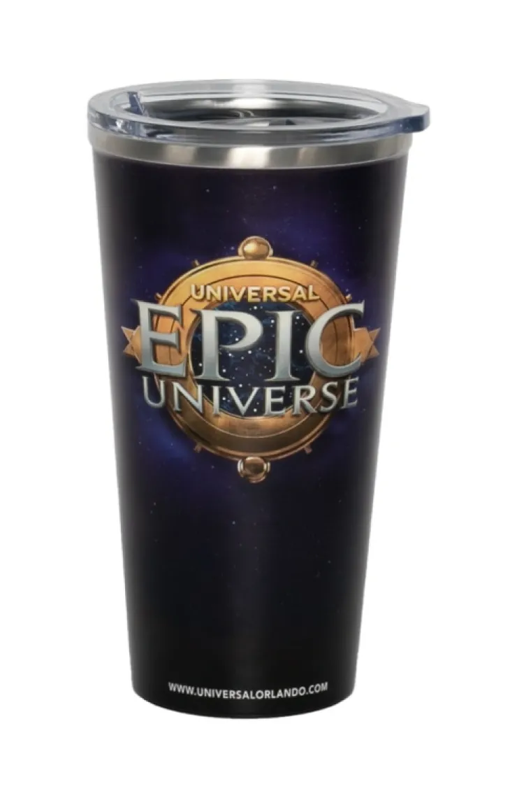 Epic Universe stainless steel freestyle tumbler featuring the Epic Universe logo on a beautiful deep blue starry backgro…