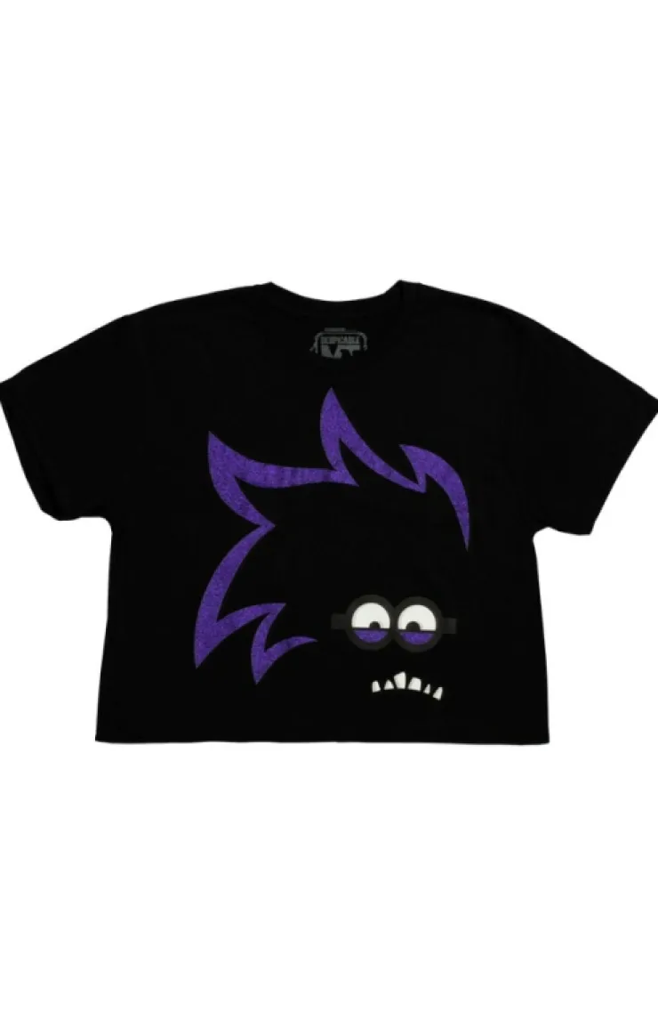 Show your love for all the Evil Minions out there with this trendy and lightweight, ladies crop t-shirt featuring the iconic purple hair and buck teeth. The soft, light weight black garment is contrasted by the purple glitter of the Minion's hair.