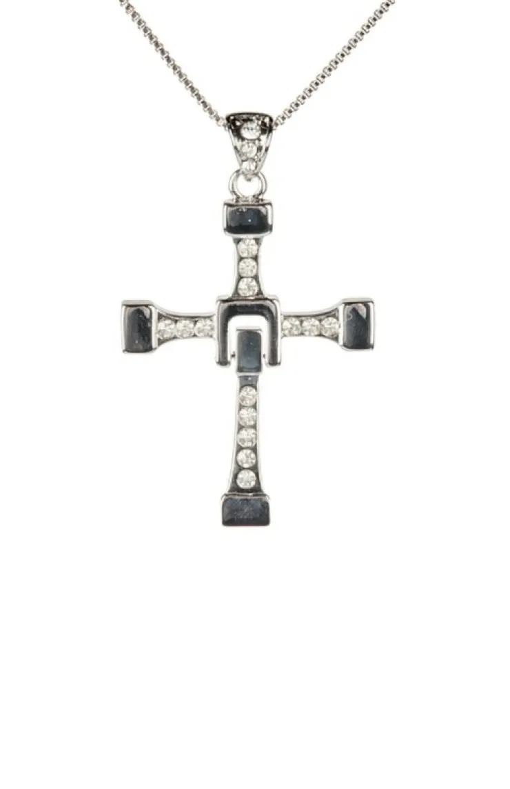Dazzle those around you with this elegant necklace, featuring a rhinestone accented cross and a molded Fast & Furious charm.