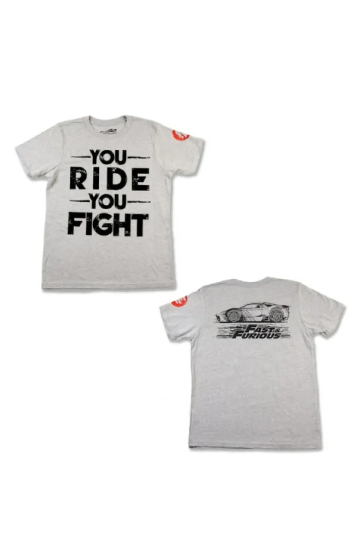 Big, bold, flocked letters stating "You ride you fight" and a screen printed car racing by on the back, this t-shirt will be sure to make a statement wherever you go.