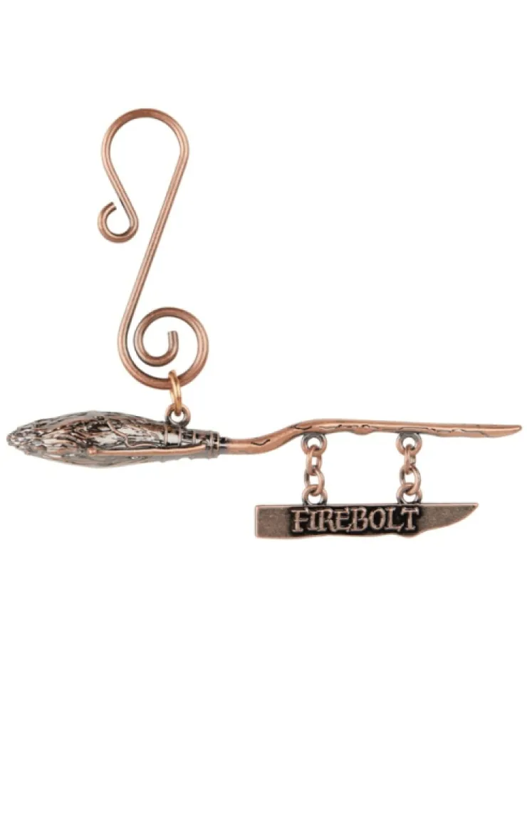 Detailed ornament featuring a Firebolt broom on sculpted, copper-tone brushed metal with a molded charm and spiral ornament hook for hanging.