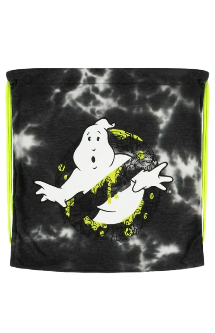 Ghostbusters drawstring bag with Glow-In-The-Dark inks in a black and white tie-dye featuring the iconic Ghostbusters no ghost logo in a fun hand drawn doodle design.