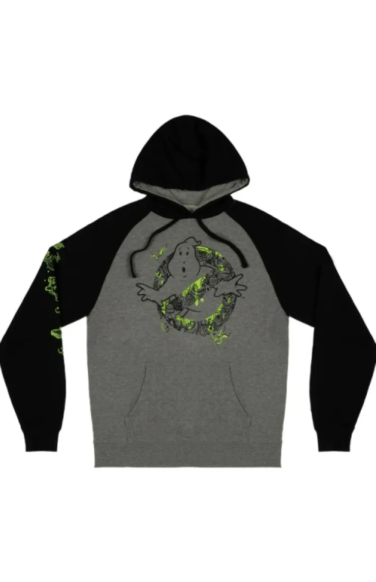 Ghostbusters hooded pullover adult fleece In the color gray with black sleeves featuring the iconic Ghostbusters no ghost logo in a fun hand drawn doodle design.