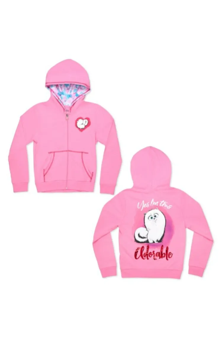 Adorable and proud of it? Show it off in this zip-up hooded sweatshirt featuring Gidget and "Yes I’m This Adorable" printed across the back of soft, pink garment with a brightly patterned hood interior and accent stitching along the front pockets & hood.