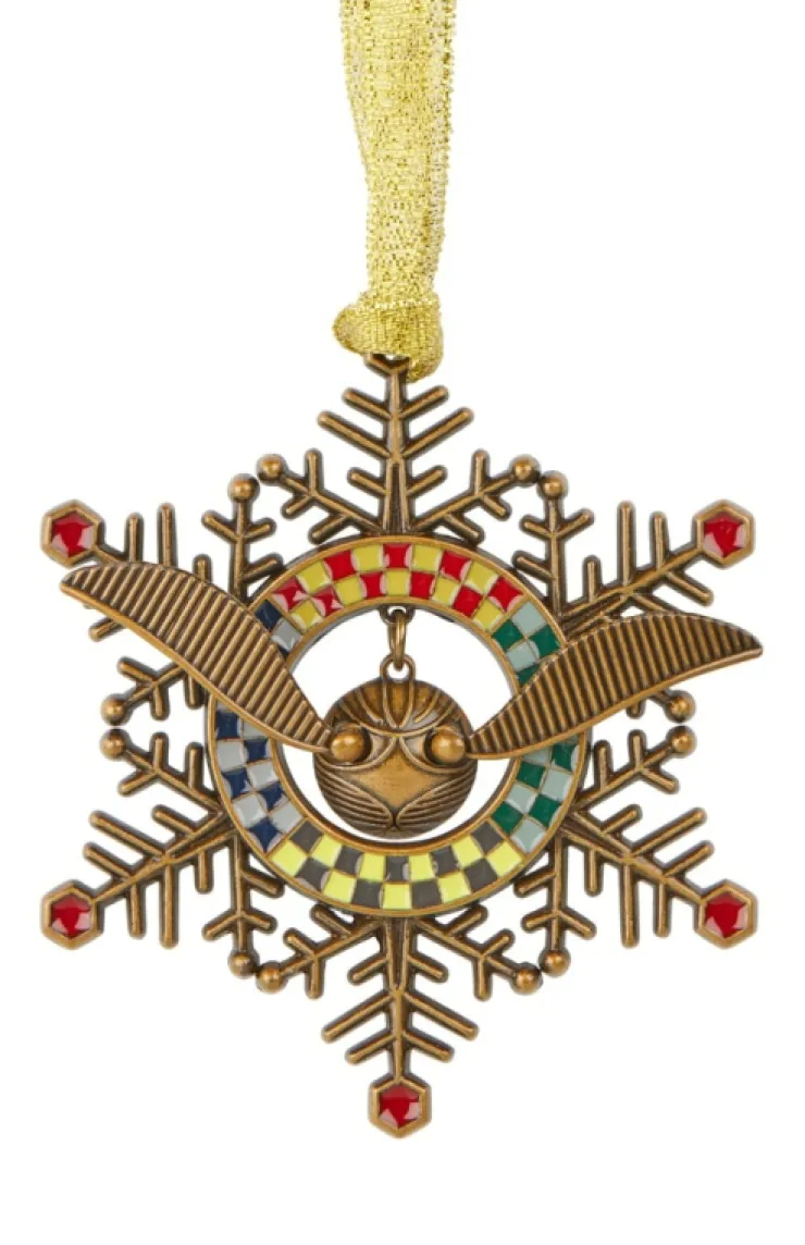 Beautiful ornament featuring a Golden Snitch dangle charm in the center of a brushed metal snowflake accented by Hogwarts™ house colors and shimmering gold-tone ribbon for hanging.