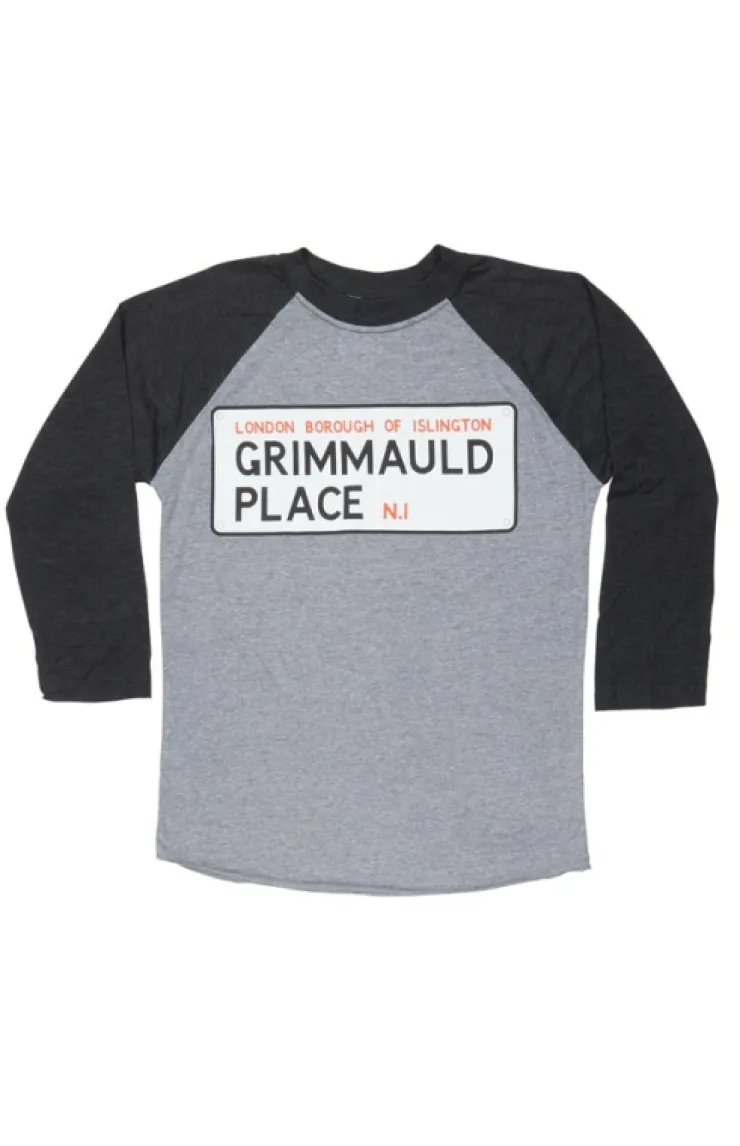 Raglan t-shirt featuring "London Borough of Islington, Grimmauld Place N.I" printed on a heathered, grey shirt with black neckline and sleeves.