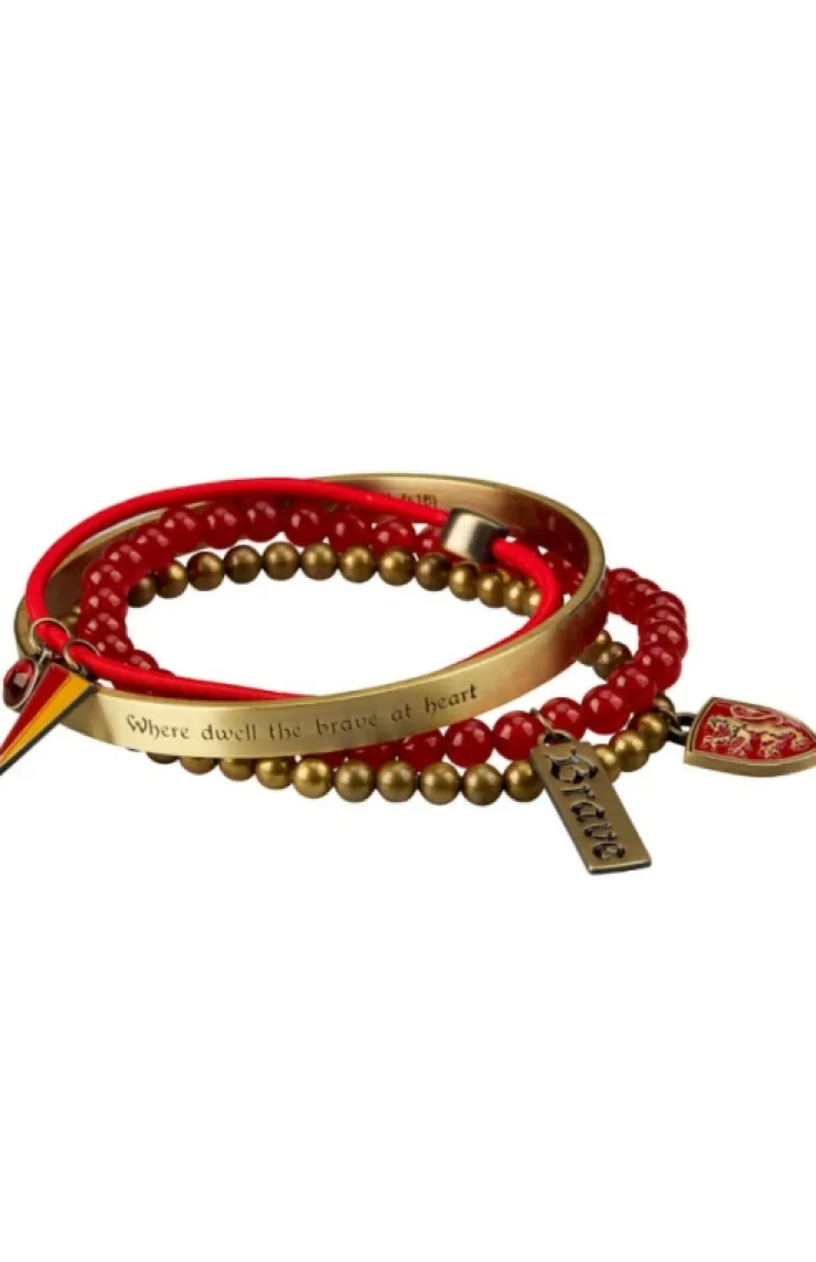 Four-piece set of Gryffindor themed bracelets. Set features an elegant gold-tone bangle bracelet with "Where dwell the brave at heart" engraved, house colors, and four Gryffindor charms.
