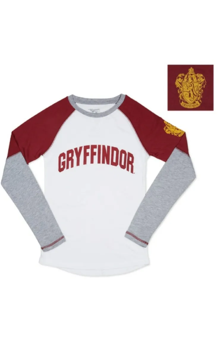 Long-sleeved color blocked raglan t-shirt featuring Gryffindor screen printed on front of comfortable, tri-tone shirt body with house crest print on left sleeve from The Wizarding World of Harry Potter™.