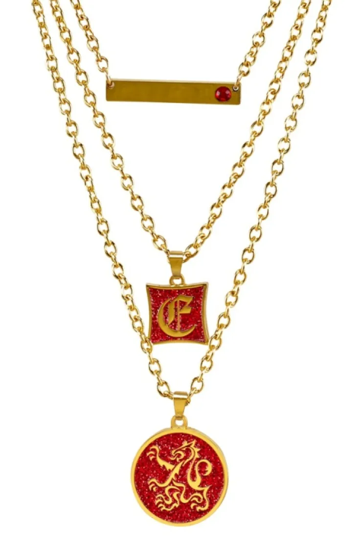 Intricately detailed gold-tone layered necklace featuring three separate Gryffindor charms. The lowest charm features the house icon with a red glittered background, the middle charm has the same background with the letter G, and the upper most charm features a gold bar with a red stone.