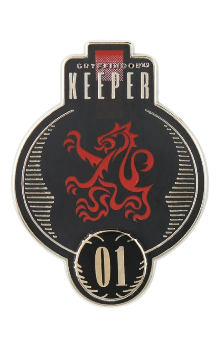 Gryffindor Quidditch Keeper pin featuring the house icon, color, and a Golden Snitch™ with "01" in silver-tone lettering below.