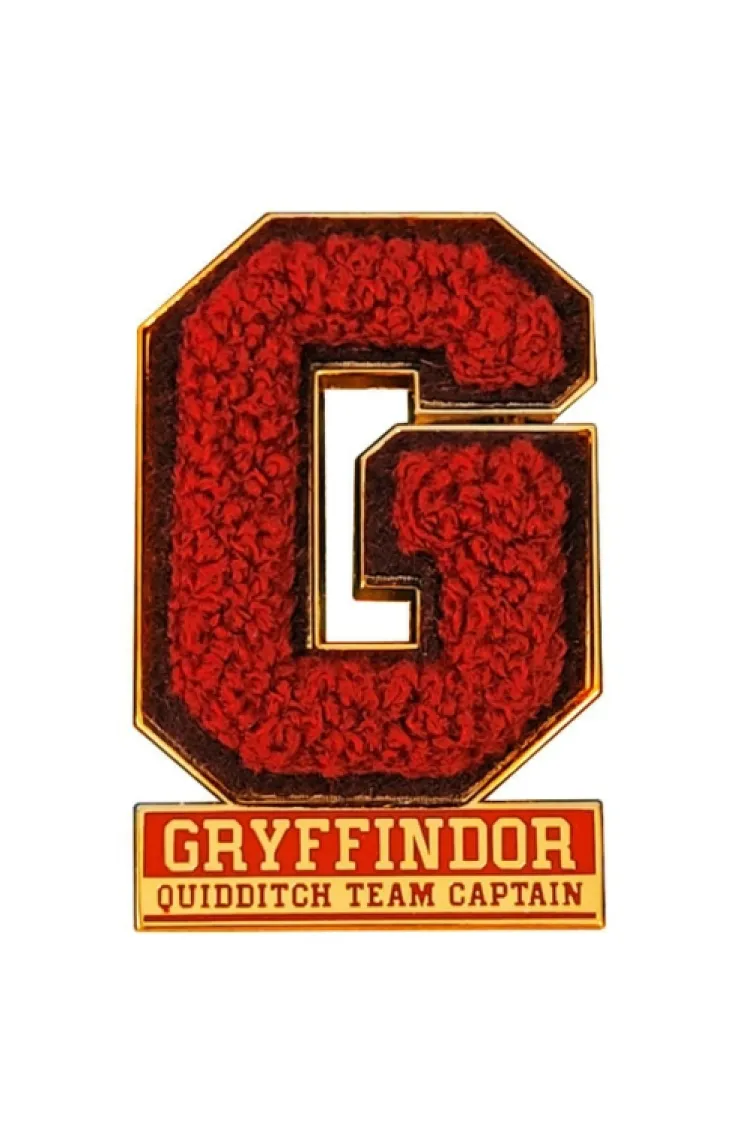 Gryffindor Quidditch™ Team Captain gold-tone pin featuring a felt "G" in scarlet chenille fabric.