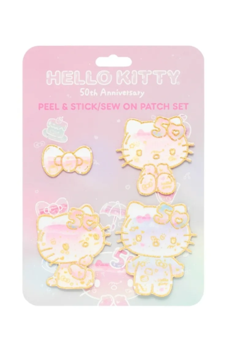 Hello Kitty four patch set featuring fun and cute designs with gold details celebrating the 50th Anniversary of Hello Kitty.