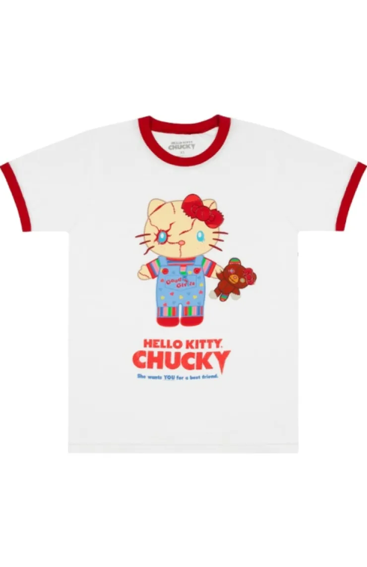 Hello Kitty adult ringer t-shirt in the color white featuring Hello Kitty as the famous doll Chucky.