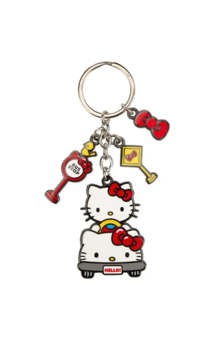 Cute Hello Kitty keychain featuring charms of her driving, street signs, and iconic bow enamel filled on silver-tone metal.