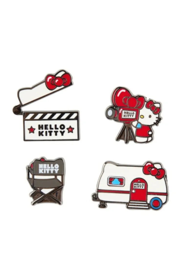 Adorable, miniature four-piece pin set featuring Hello Kitty and her production set enamel filled on silver-tone metal.