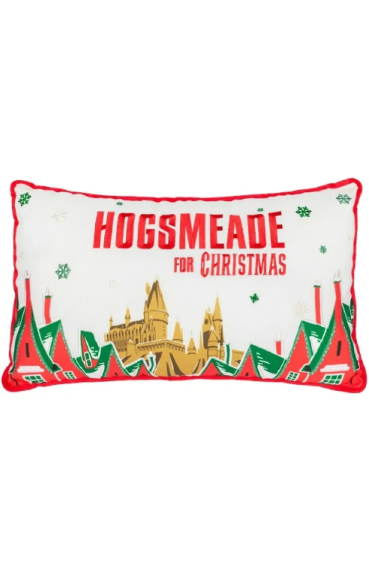 The Wizarding World of Harry Potter™ pillow featuring Hogsmeade™ village with Hogwarts™ castle in the distance and "Hogsmeade™ for Christmas" across the top. Reverse side features a green plaid Hogwarts™ crest allover pattern.