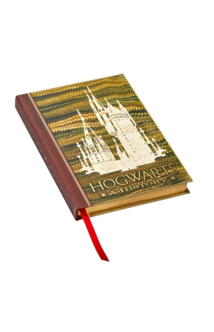 Lined journal with a replica of "Hogwarts – A History" textbook cover designed by MinaLima for the Harry Potter™ films. The beautifully detailed cover is printed on thick cardboard with gold foil edging around the pages and includes a sewn-in scarlet ribbon bookmark.