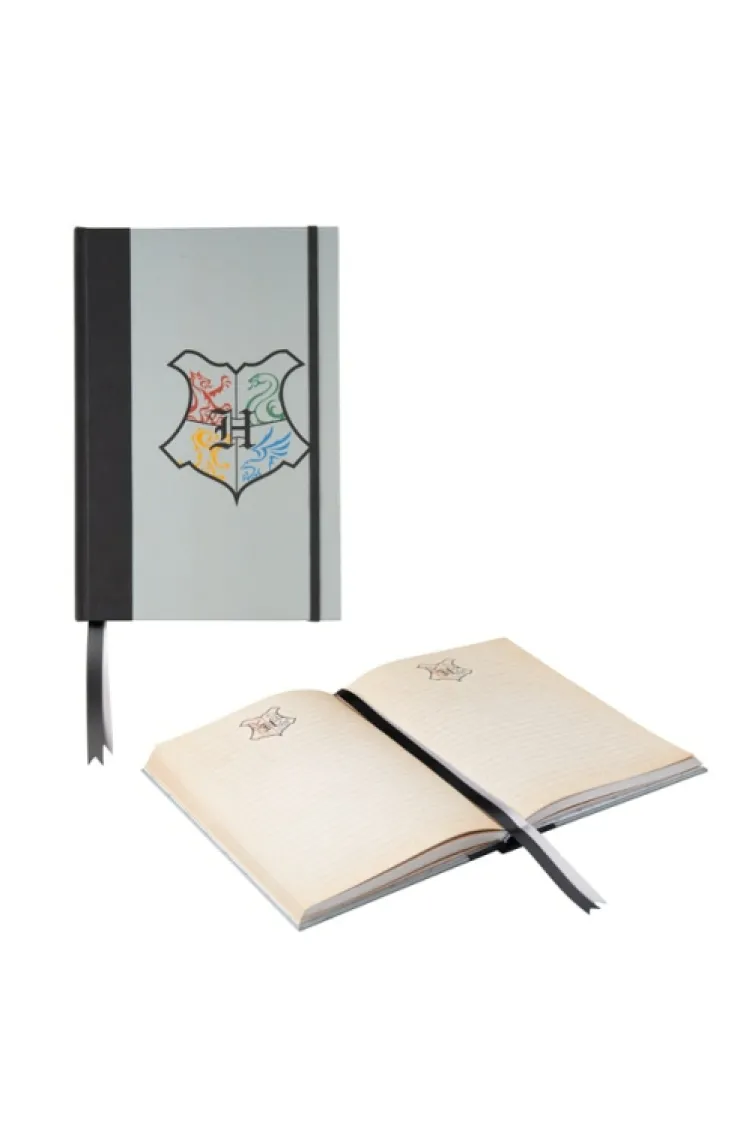Hogwarts Alumni journal with lined, parchment-like textured pages, a stylized Hogwarts crest on front cover, sewn in black & silver ribbon bookmarks, and elastic band closure.