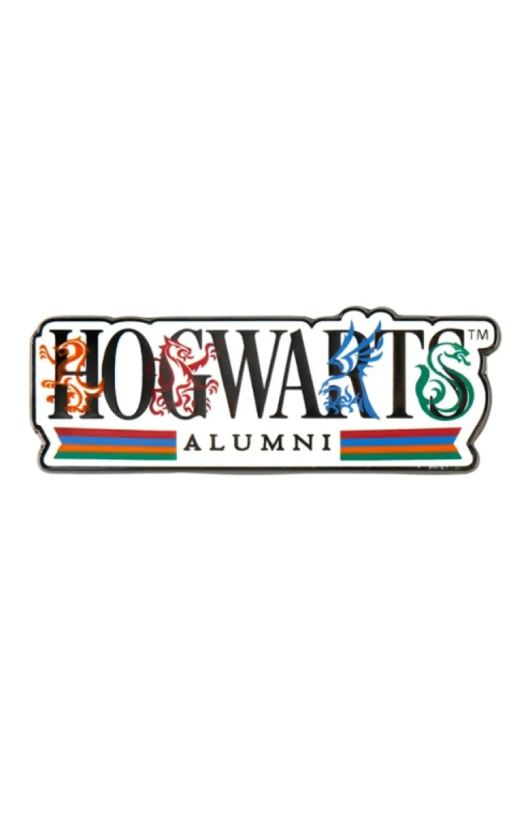 Represent school pride with this Hogwarts Alumni magnet featuring the Hogwarts Alumni logo adorned with house colors and icons. Design is enamel filled on silver-tone metal.