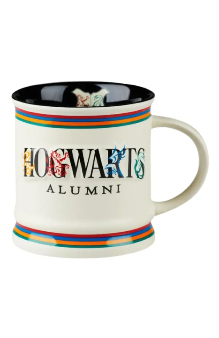 Represent school pride with this Hogwarts Alumni ceramic molded mug. Features sleek Alumni logo adorned with house colors and icons on two sides and a stylized Hogwarts crest printed on the inside.