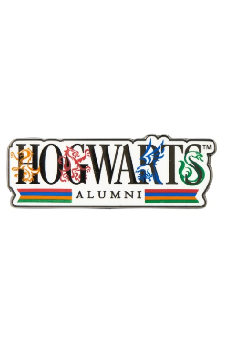 Represent school pride with this Hogwarts Alumni pin featuring the Hogwarts Alumni logo adorned with house colors and icons. Design is enamel filled on silver-tone metal.