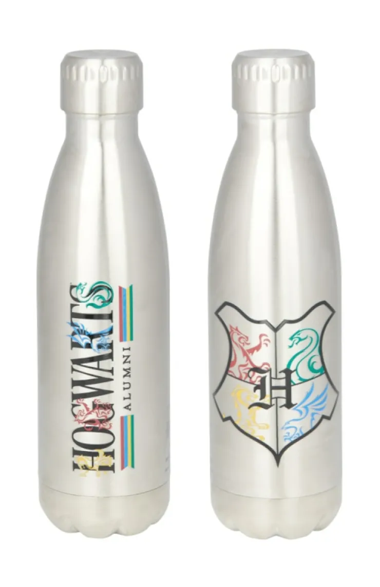 Represent school pride with this take-anywhere-style, Hogwarts Alumni bottle. Stainless steel design features sleek Alumni logo adorned with house colors and icons on one side, and a stylized Hogwarts crest on the other.