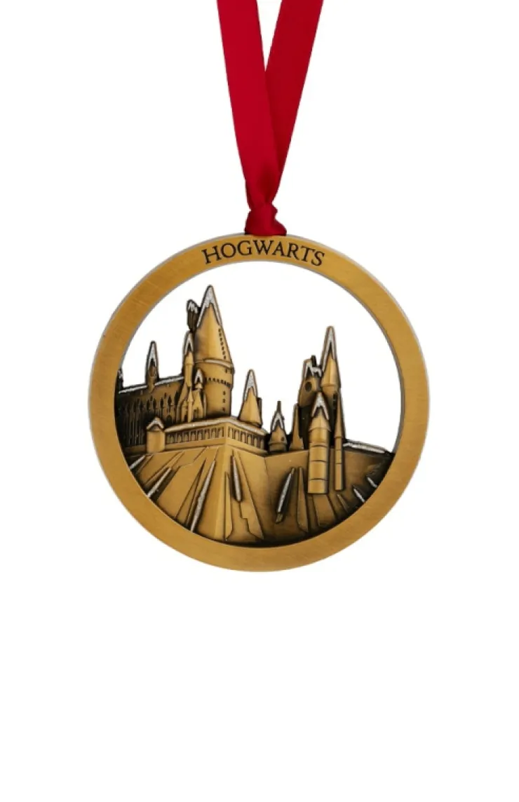 The Wizarding World of Harry Potter™ holiday ornament featuring the Hogwarts castle in a gold-tone metal on a red satin ribbon.