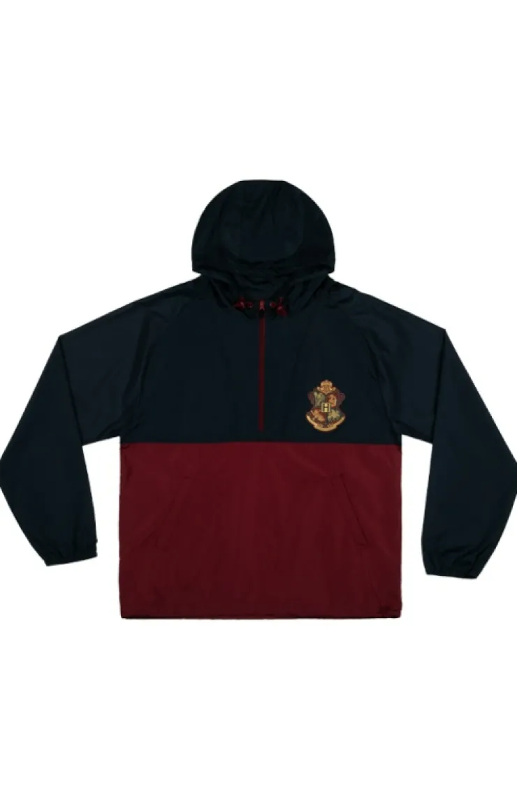The Wizarding World of Harry Potter™ adult hooded windbreaker in a two-tone color scheme of navy and burgundy featuring the Hogwarts Crest.