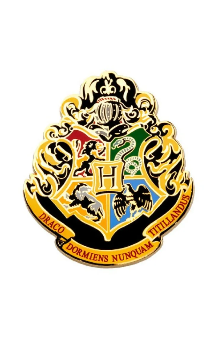 This Hogwarts crest pin is multicolored, hard enamel fill with a gold-plated finish and black detailing. Measures approximately 1 1/2 x 2 inches.