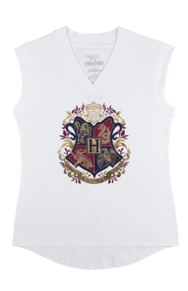From The Wizarding World of Harry Potter™, ladies sleeveless t-shirt with a rounded hem and v-neck featuring the Hogwarts crest on the front, and "Hogwarts" going down the middle back. Design is screen printed with gold-foil accents on a white lightweight garment.