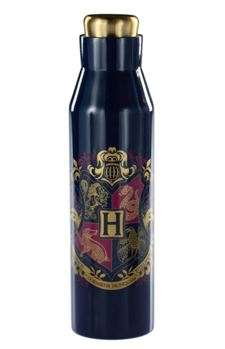 Represent school pride with this take-anywhere-style, Hogwarts crest bottle. Stainless steel design features the Hogwarts crest in red and cold on one side, and "Hogwarts" written in gold on the other.