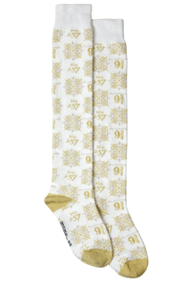 Hogwarts Express knee high socks featuring "Platform 9 3/4™" and "No. 257" logos patterned throughout this shimmering design. Comfy knit socks are accented by gold-tone detailing, toe, and heel.
