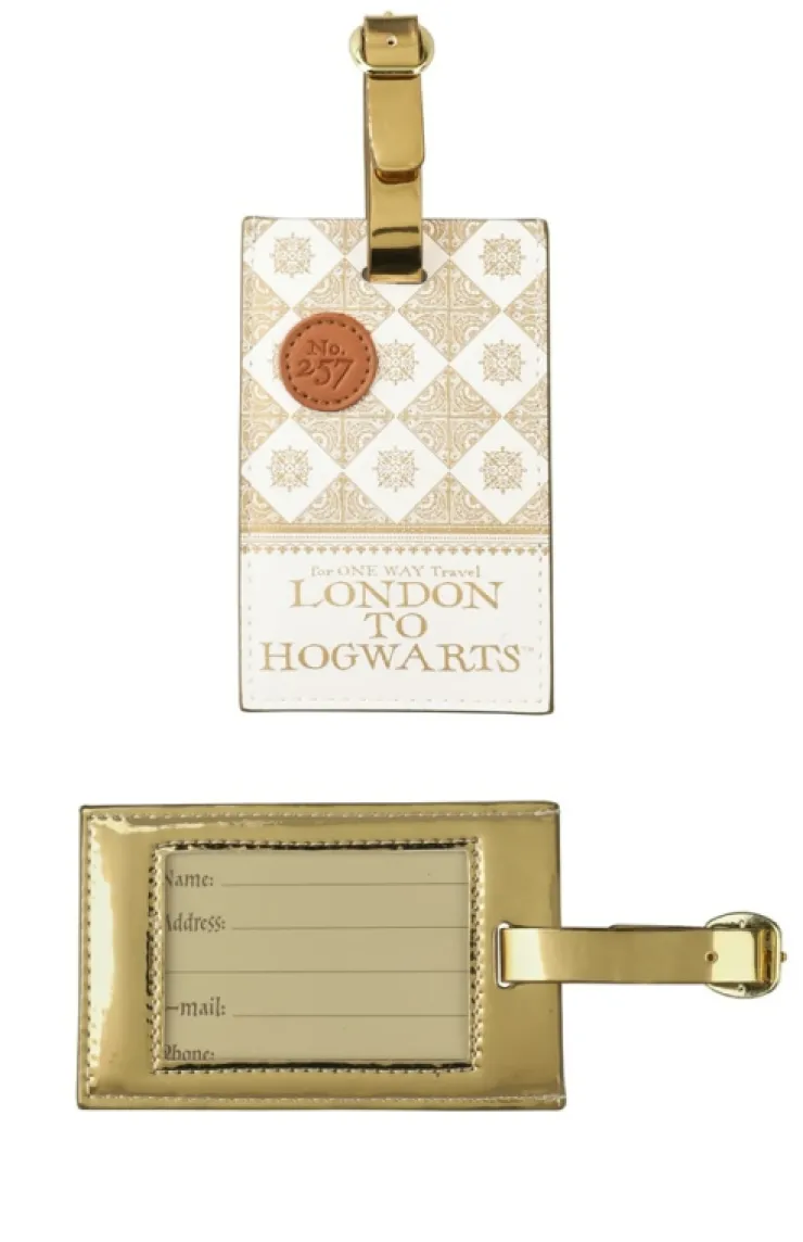 Hogwarts Express Ticket luggage tag with "London to Hogwarts" and stitched "No. 257" logo on the front. Tag features an adjustable buckle strap and cut out window with a printed address card on the reverse side.