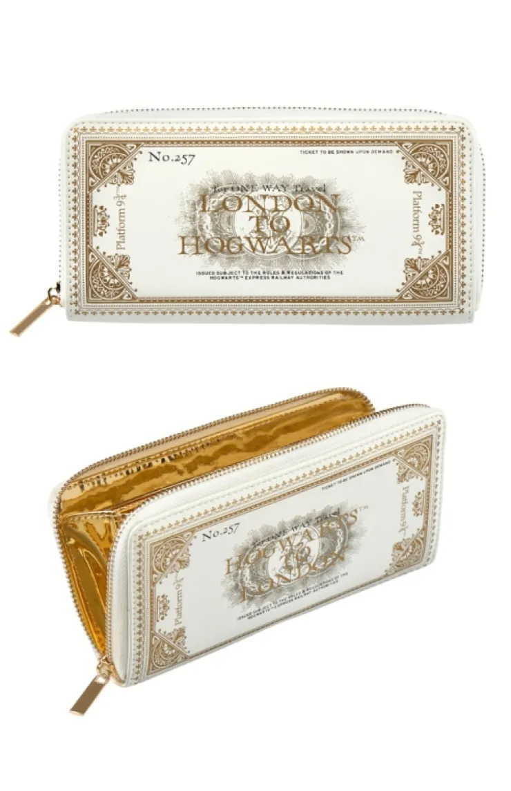 Elegant Hogwarts Express Train Ticket inspired wallet with "London to Hogwarts" on one side and "Hogwarts to London" on the other. Design is featured on soft faux-leather body with striking gold-tone interior, metal accents, and zippered compartment with multiple interior pockets perfect for your personal items.