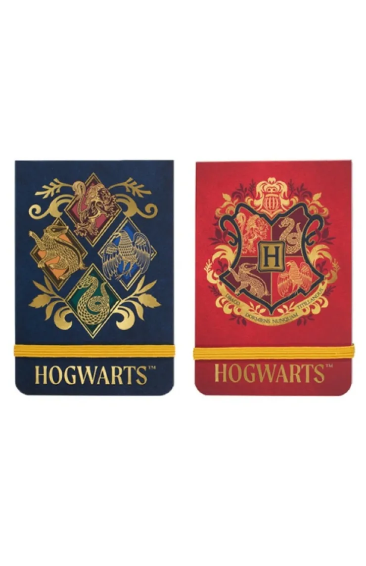 Set of two pocket-sized Hogwarts flip note pads with elastic closure. One note pad features the Hogwarts crest with gold accents on a scarlet background, while the other features the four house icons with gold accents on a navy-blue background.