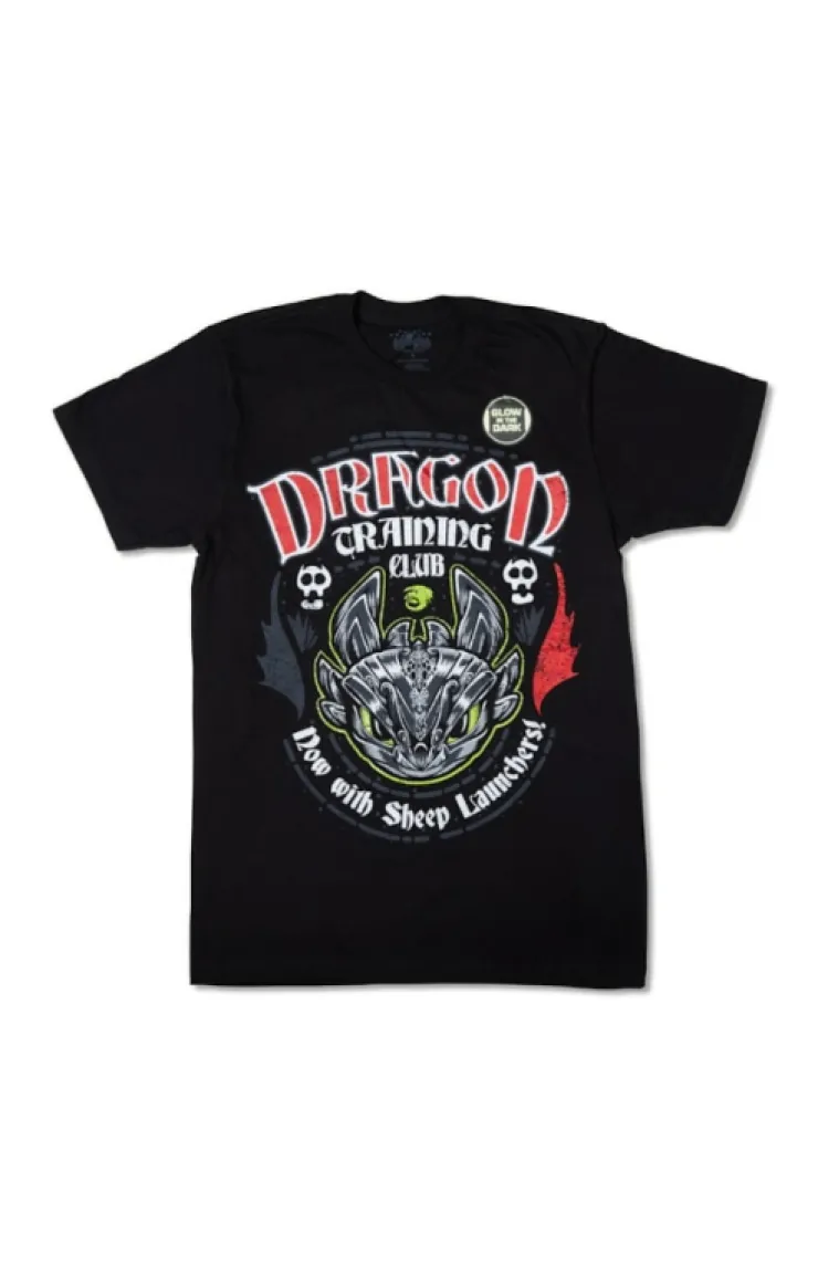 Proud member of the "Dragon Training Club"? Show it off with this colorful, glow-in-the-dark t-shirt screen printed on solid-black garment from How to Train Your Dragon.